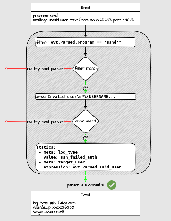 While a lot of parsers rely on the GROK approach (a.k.a regular expression named capture groups), parsers can also use expressions to perform parsing on specific data (ie. json), refer to external methods for enrichment or even perform whitelisting.